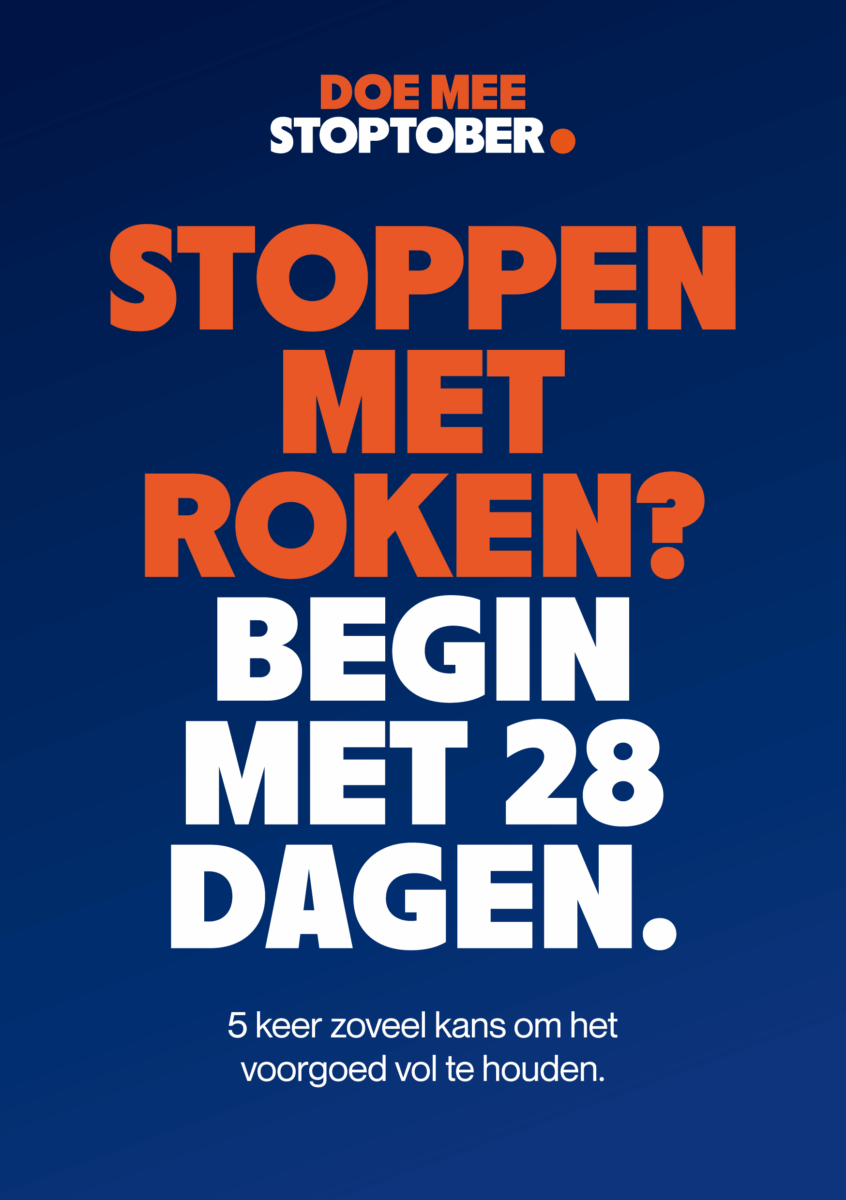 A5 Flyer 'Stoppen met roken? Begin met 28 dagen.' Flyer is A5-formaat om uit te delen om zo rokers te motiveren mee te doen met Stoptober. Download